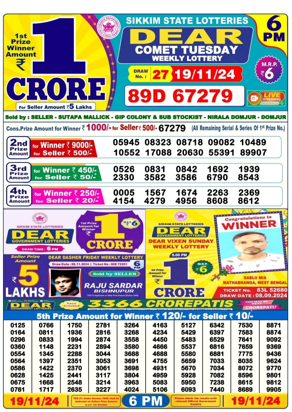 Dear comet tuesday weekly lottery 6pm result 19/11/24 19-11-2024 Leave a Comment on Dear comet tuesday weekly lottery 6pm result 19/11/24