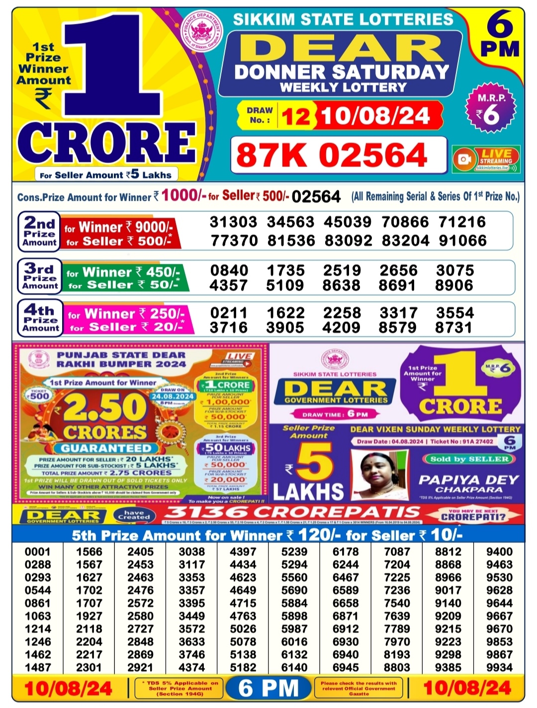 Dear donner saturday weekly lottery 6pm result 10/08/24 10-08-2024 Leave a Comment on Dear donner saturday weekly lottery 6pm result 10/08/24