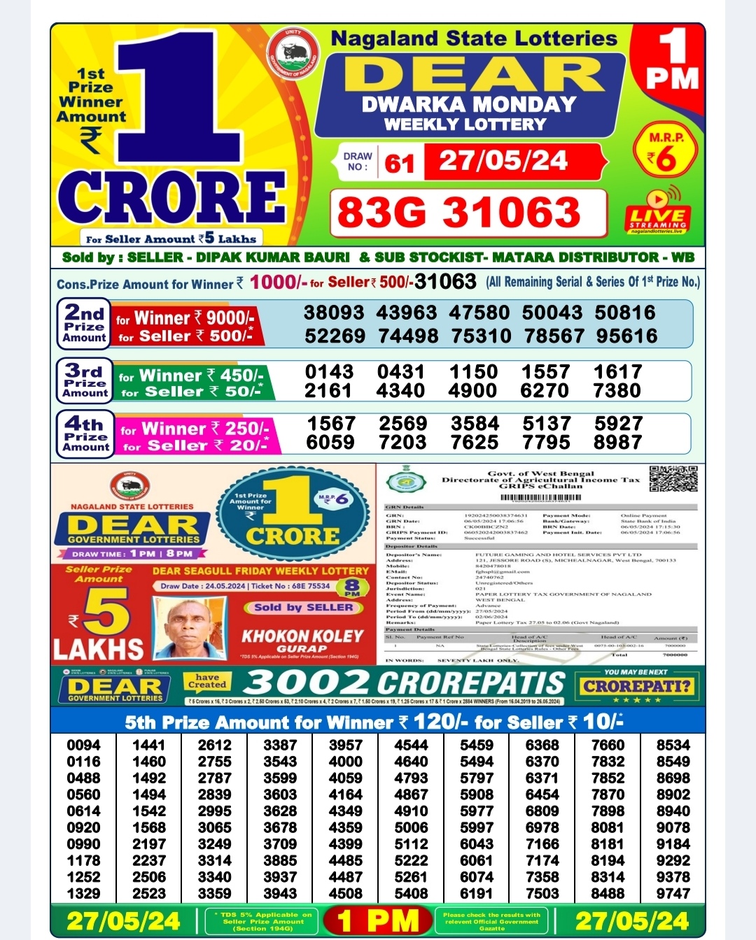 Dear dwarka monday weekly lottery 1pm result 27/05/24 27-05-2024 Leave a Comment on Dear dwarka monday weekly lottery 1pm result 27/05/24