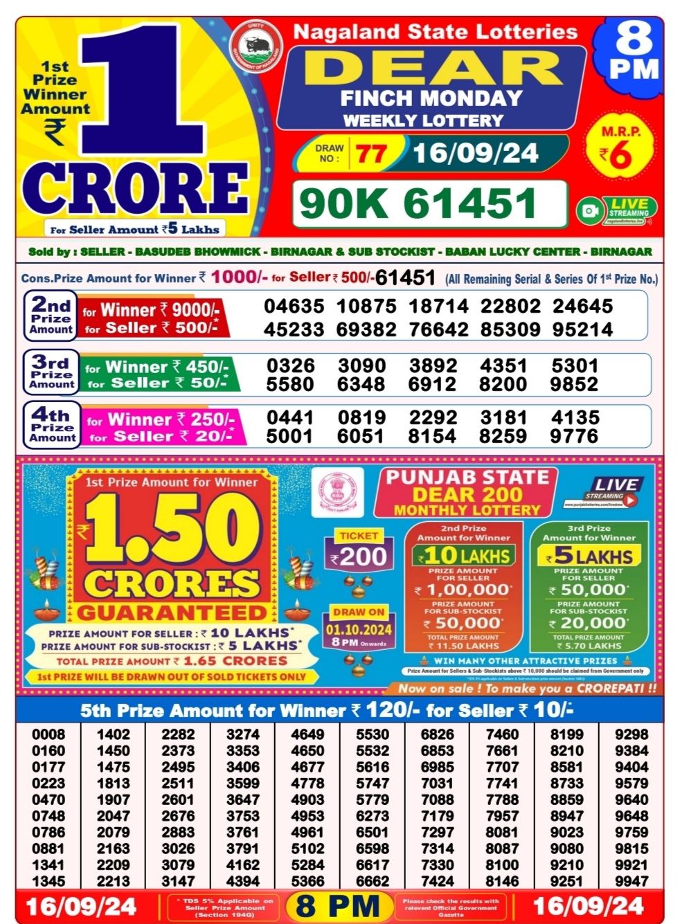 Dear finch monday weekly lottery 8pm result 16/09/24 16-09-2024 Leave a Comment on Dear finch monday weekly lottery 8pm result 16/09/24