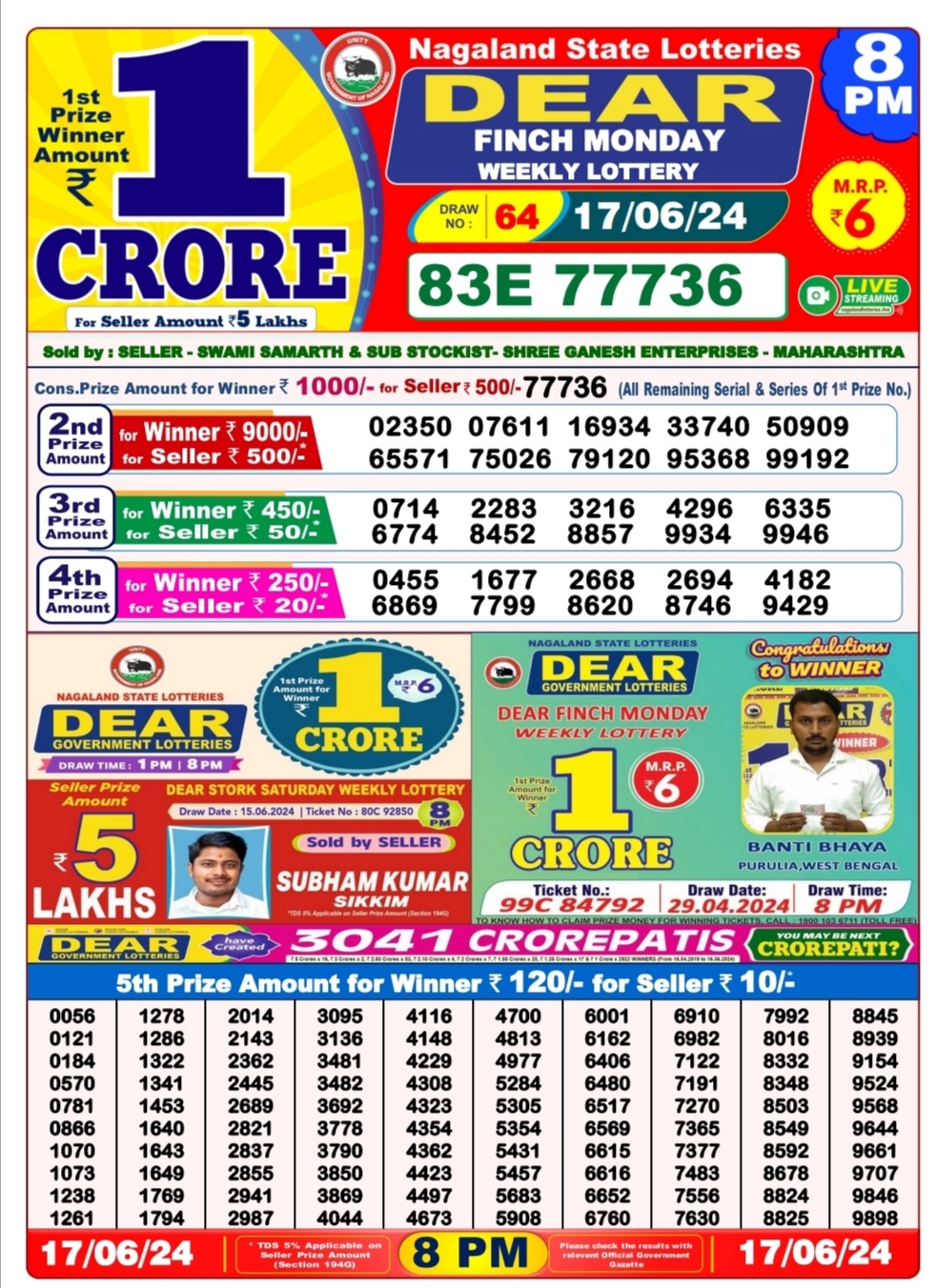 Dear finch Monday weekly lottery 8pm result 17/06/24 17-06-2024 Leave a Comment on Dear finch Monday weekly lottery 8pm result 17/06/24