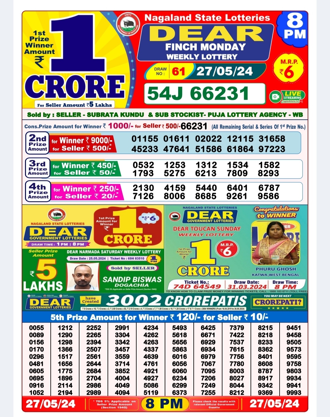 Dear Finch monday weekly lottery 8pm result 27/05/24 27-05-2024 Leave a Comment on Dear Finch monday weekly lottery 8pm result 27/05/24