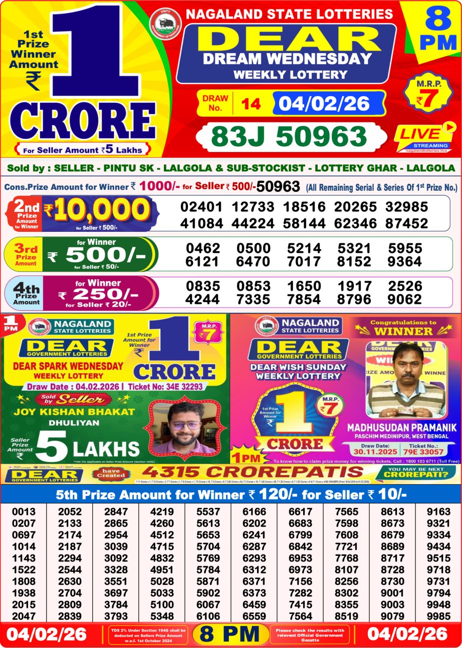 Results for 8 PM draw of Dear Dream weekly lottery 04.02.26 are being announced. Full result will be available shortly on this page.