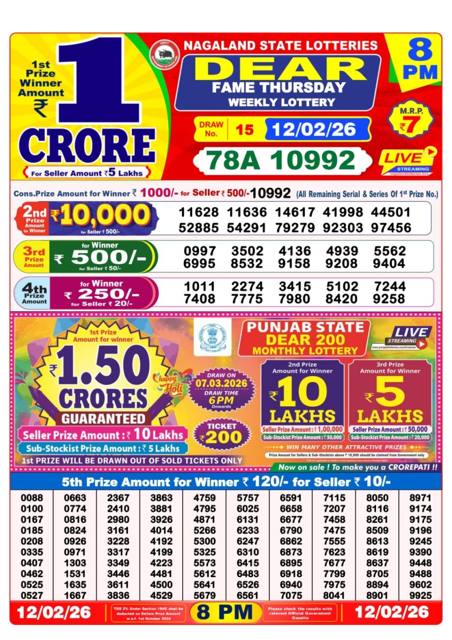Results for 8 PM draw of Dear Fame weekly lottery 12.02.26 are being announced. Full result will be available shortly on this page.