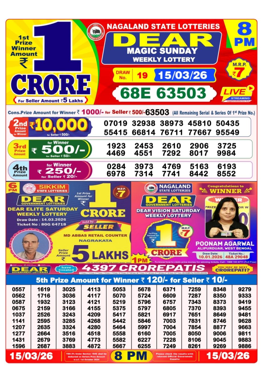 Results for 8 PM draw of Dear Magic weekly lottery 15.03.26 are being announced. Full result will be available shortly on this page.