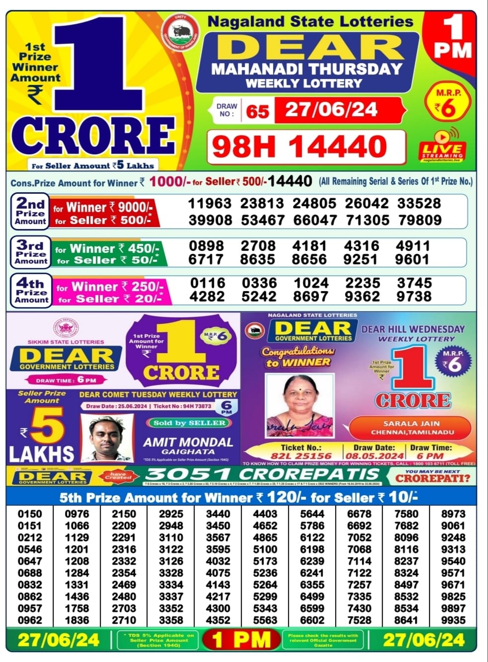 Dear mahanadi Thursday weekly lottery 1pm result 27/06/24 27-06-2024 Leave a Comment on Dear mahanadi Thursday weekly lottery 1pm result 27/06/24