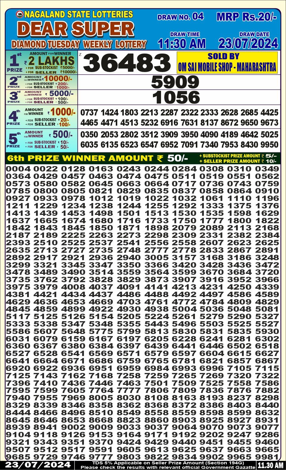 Dear super diamond tuesday weekly lottery 11.30am result 23/07/24 23-07-2024 Leave a Comment on Dear super diamond tuesday weekly lottery 11.30am result 23/07/24