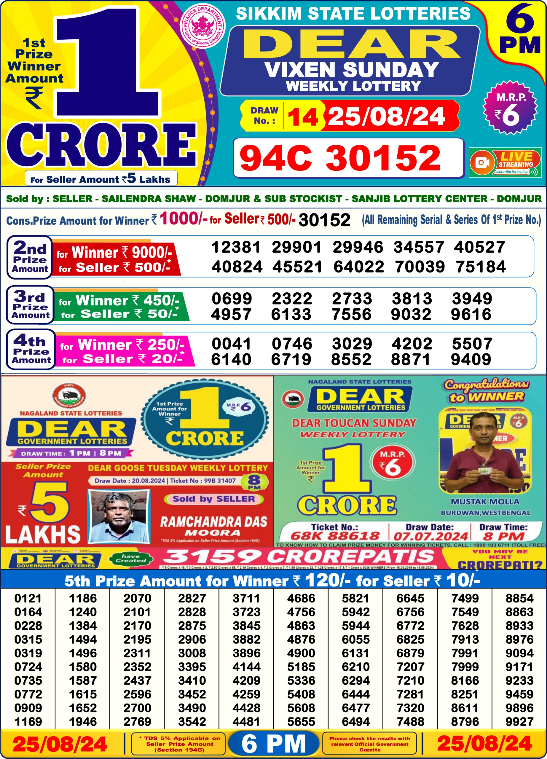 Dear vixen sunday weekly lottery 6pm result 25/08/24 25-08-2024 Leave a Comment on Dear vixen sunday weekly lottery 6pm result 25/08/24