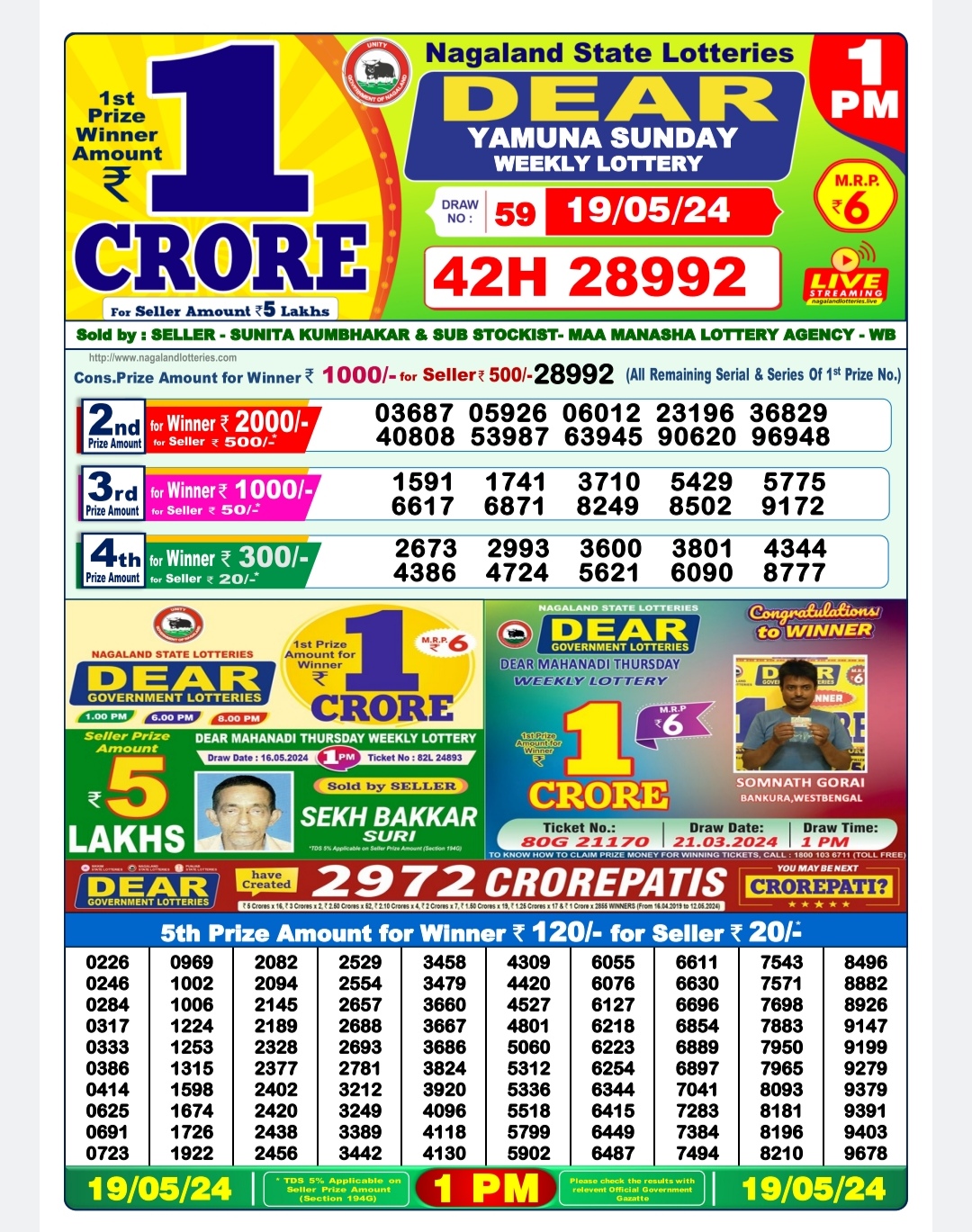 Dear yamuna sunday weekly lottery 1pm result 19/05/24 19-05-2024 Leave a Comment on Dear yamuna sunday weekly lottery 1pm result 19/05/24