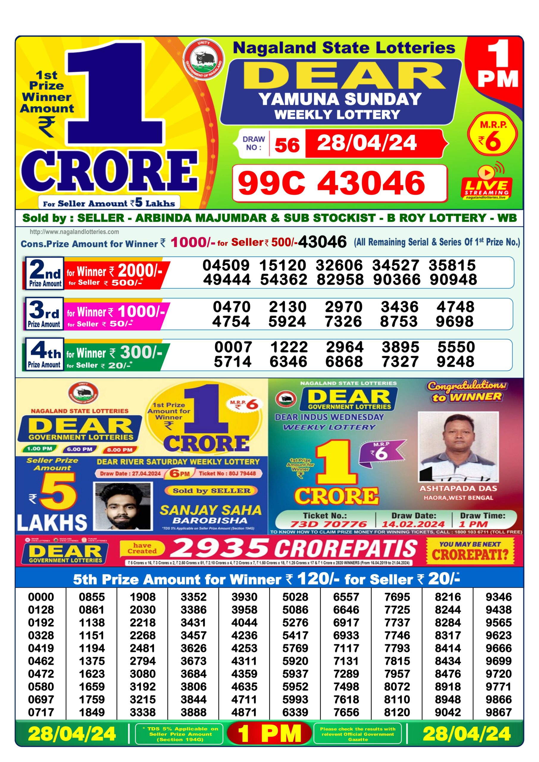 Dear yamuna sunday weekly lottery 1pm result 28/04/24 28-04-2024 Leave a Comment on Dear yamuna sunday weekly lottery 1pm result 28/04/24