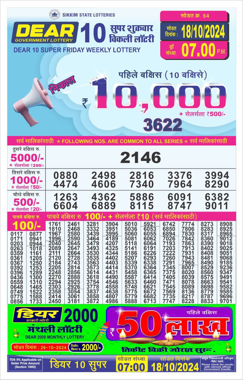 Dear10 super Friday weekly lottery 7pm result 18/10/24 18-10-2024 Leave a Comment on Dear10 super Friday weekly lottery 7pm result 18/10/24