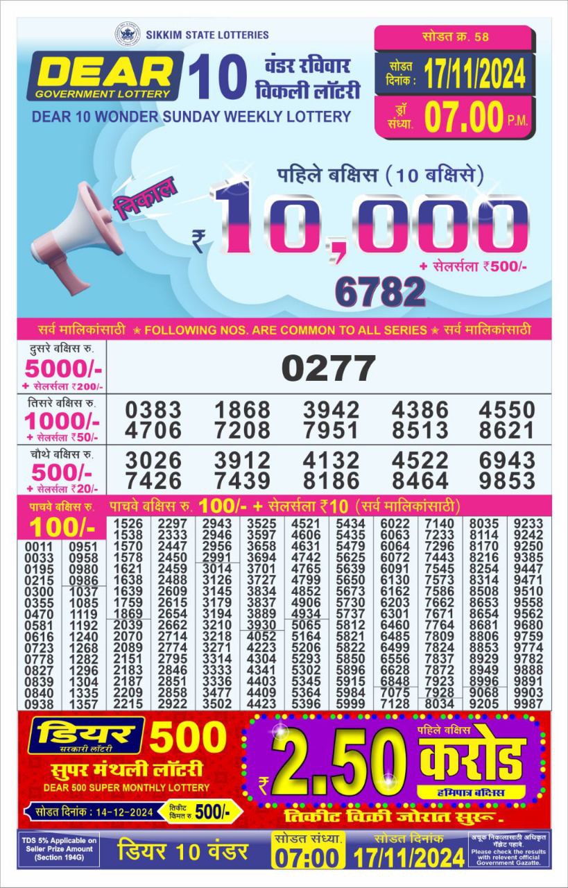 Dear10 wonder sunday weekly lottery 7pm result 17/11/24 17-11-2024 Leave a Comment on Dear10 wonder sunday weekly lottery 7pm result 17/11/24