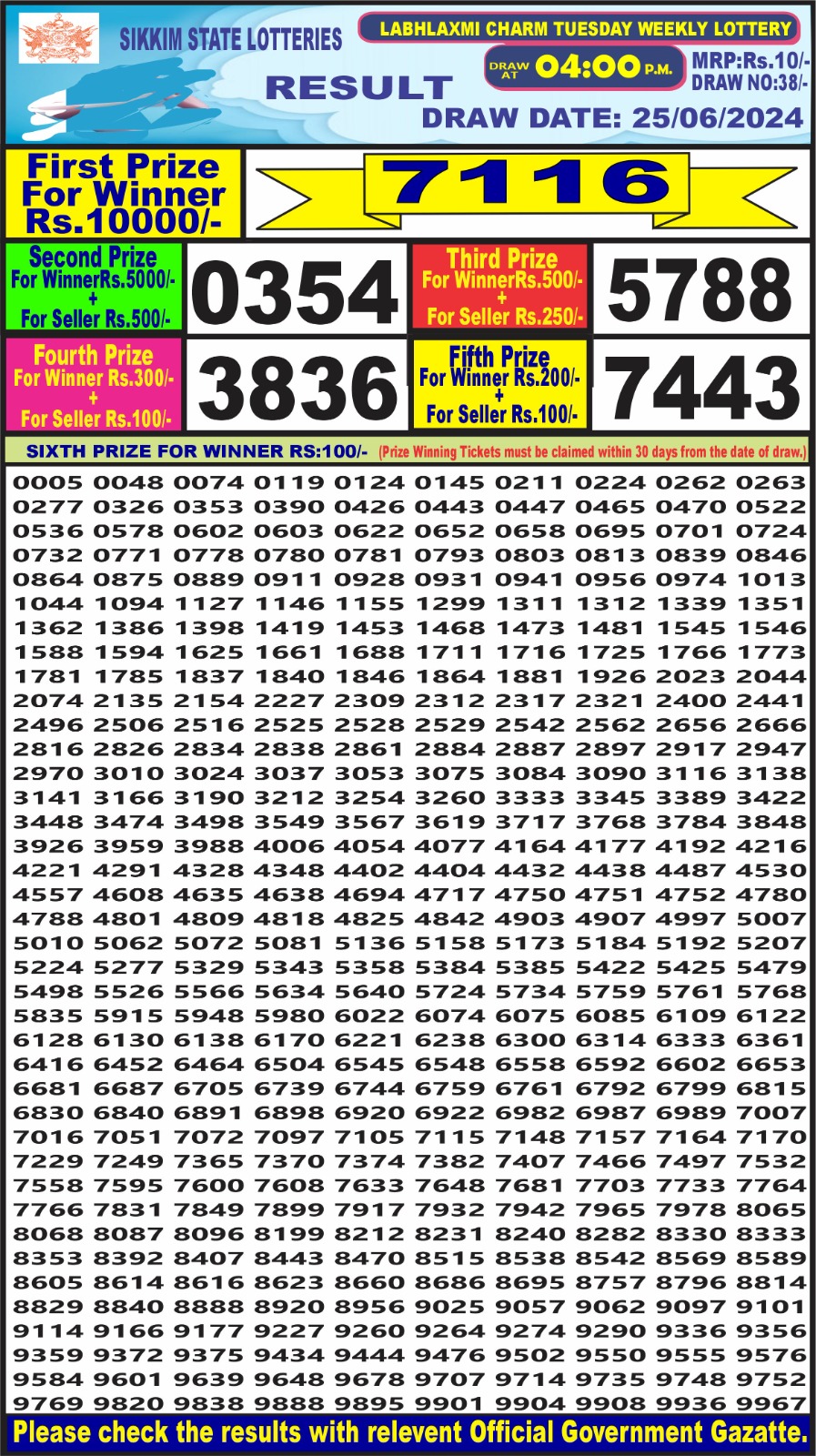 Labh laxmi charm tuesday weekly lottery 4pm result 25/06/24 25-06-2024 Leave a Comment on Labh laxmi charm tuesday weekly lottery 4pm result 25/06/24