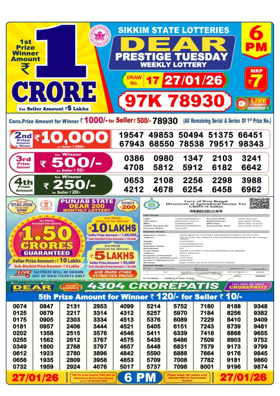 Results for 6 PM draw of Dear Prestige weekly lottery 27.01.26 are being announced. Full result will be available shortly on this page.