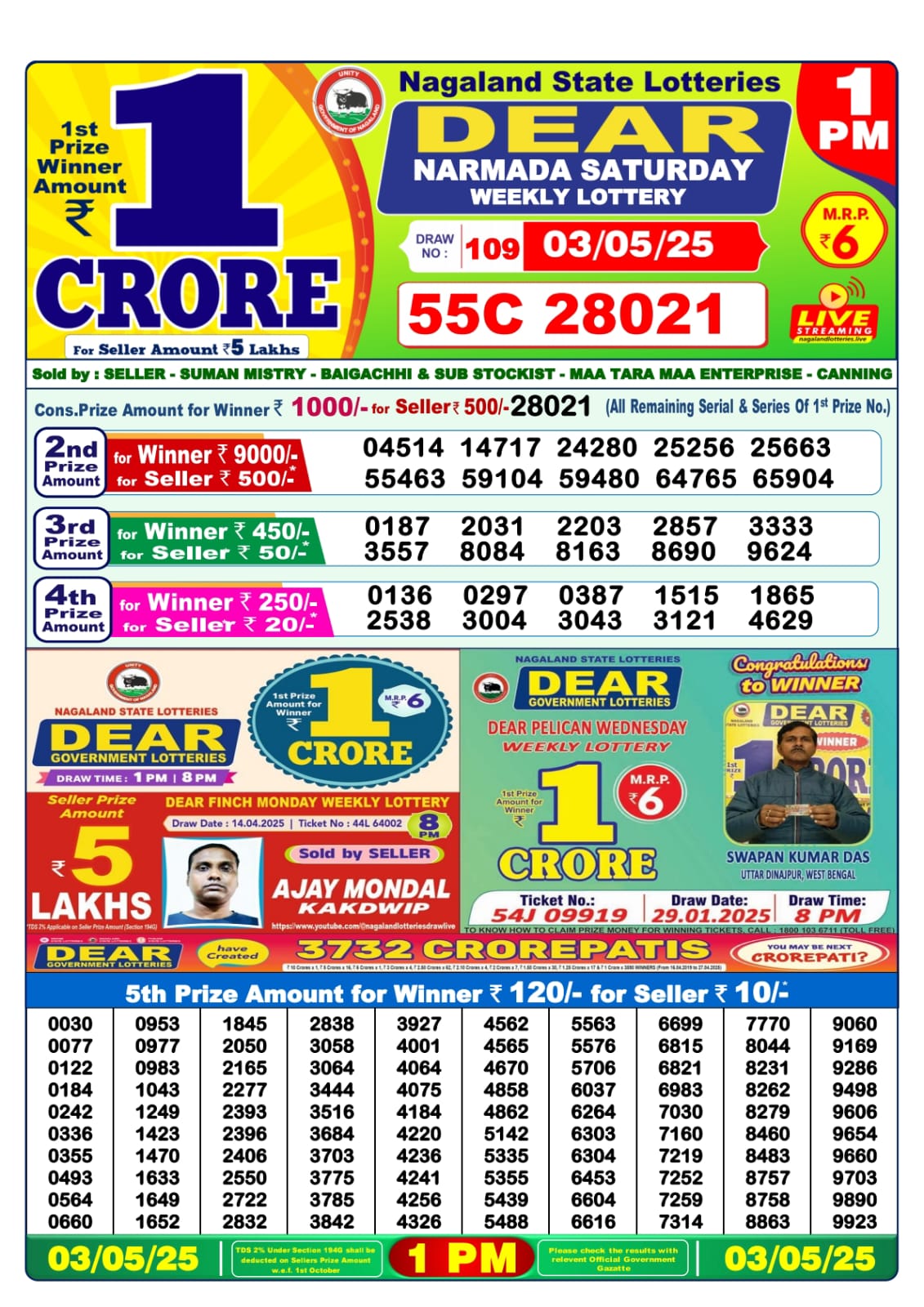 Results for 1 PM draw of Dear Vision weekly lottery 03.05.25 are being announced. Full result will be available shortly on this page.