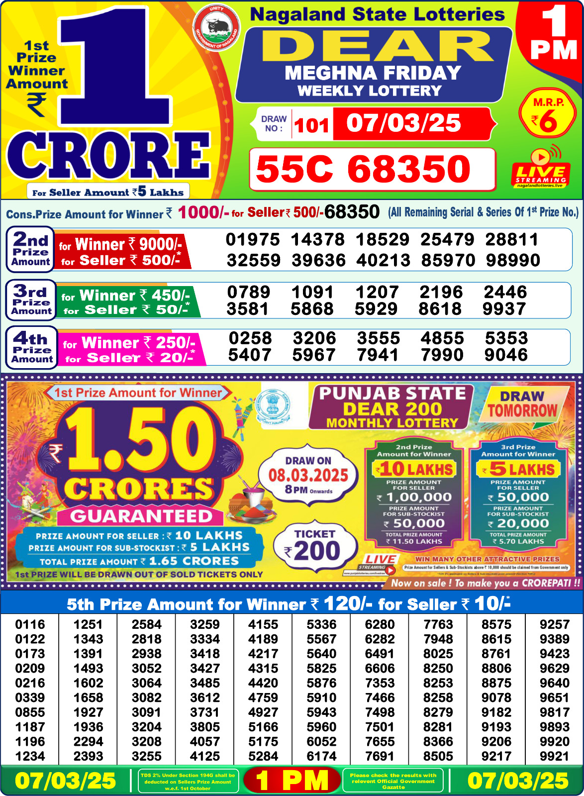 Results for 1 PM draw of Dear Victory weekly lottery 07.03.25 are being announced. Full result will be available shortly on this page.