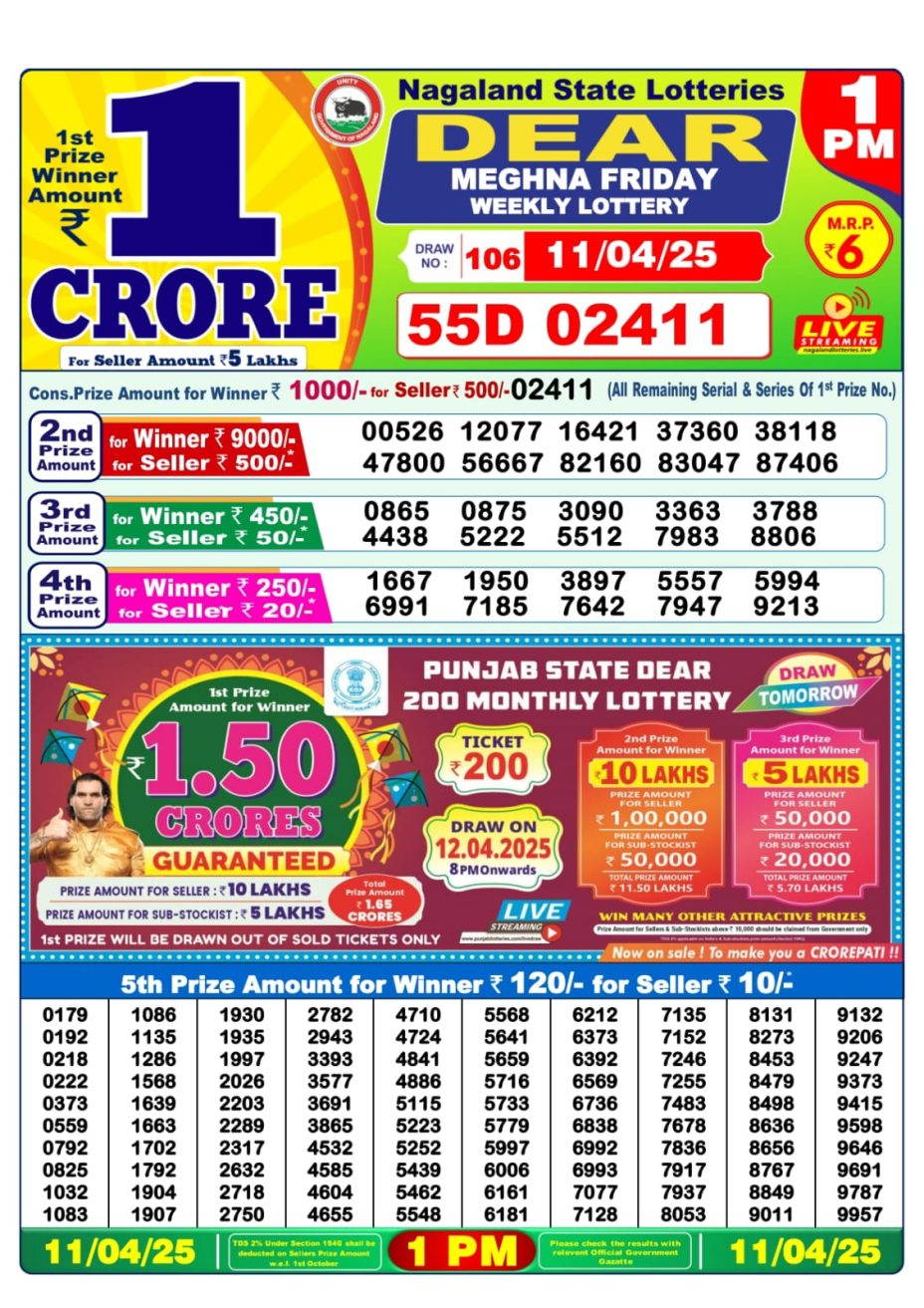Results for 1 PM draw of Dear Victory weekly lottery 11.04.25 are being announced. Full result will be available shortly on this page.
