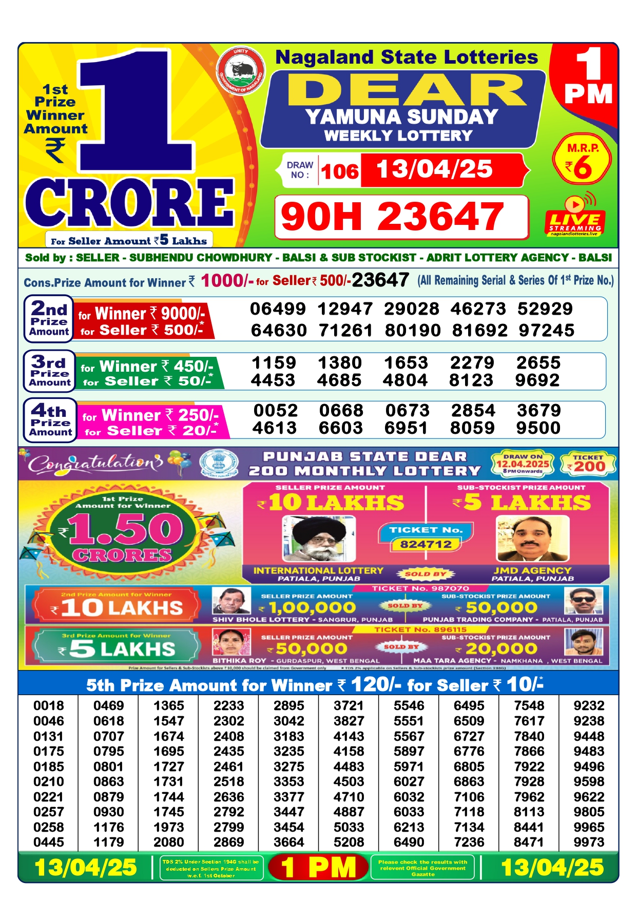 Results for 1 PM draw of Dear Wish weekly lottery 13.04.25 are being announced. Full result will be available shortly on this page.
