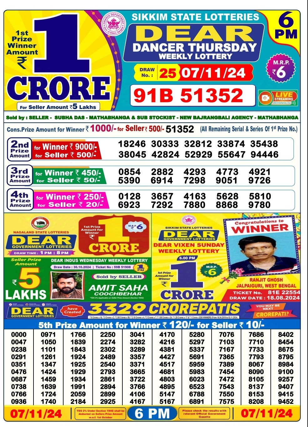 Dear dancer Thursday weekly lottery 6pm result 7/11/24