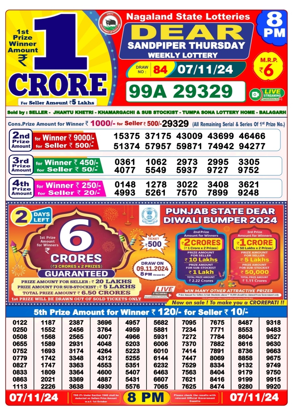 Dear super platinum Thursday weekly lottery 7pm result 7/11/24
