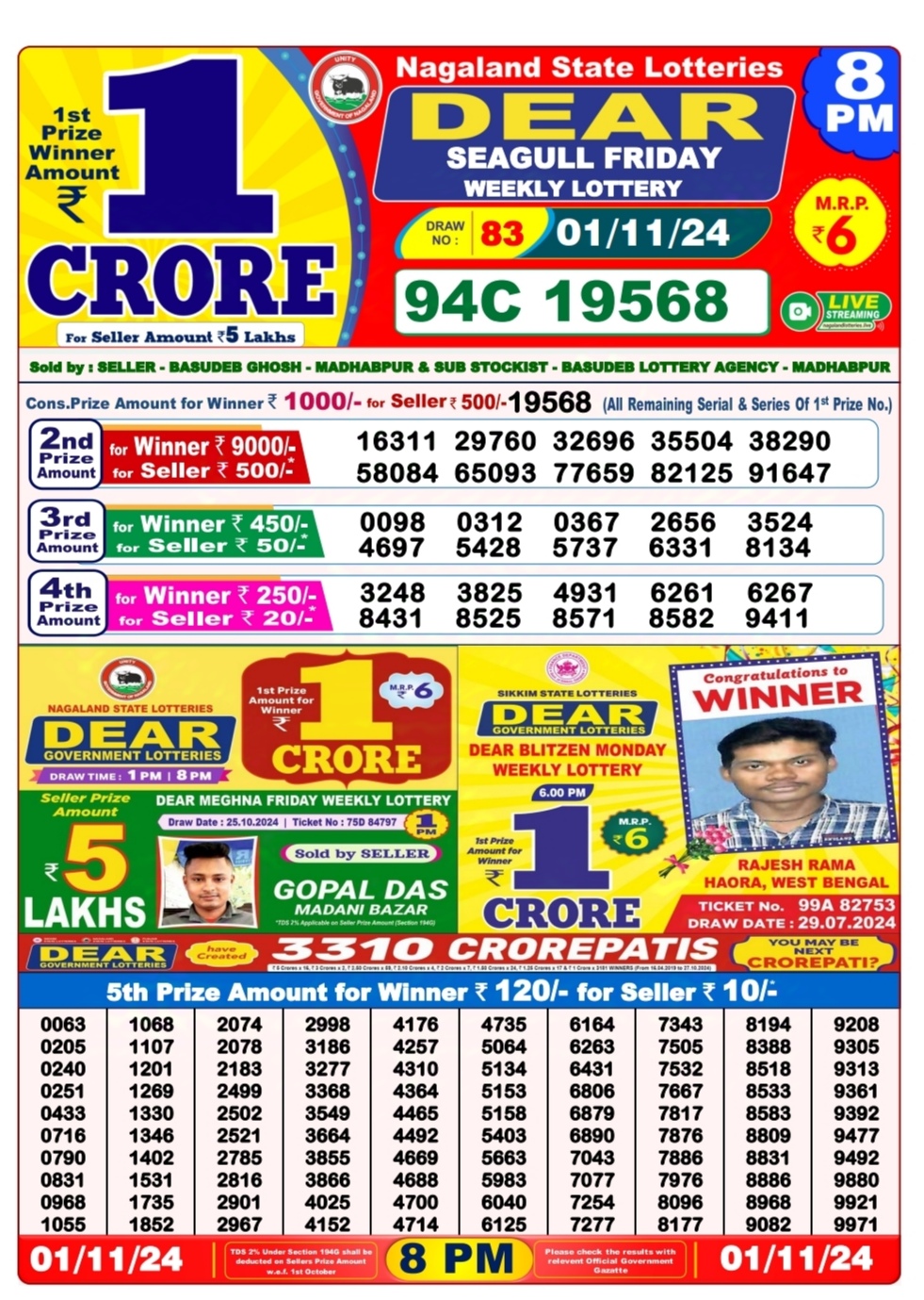 Dear seagull Friday weekly lottery 8pm result 1/11/24