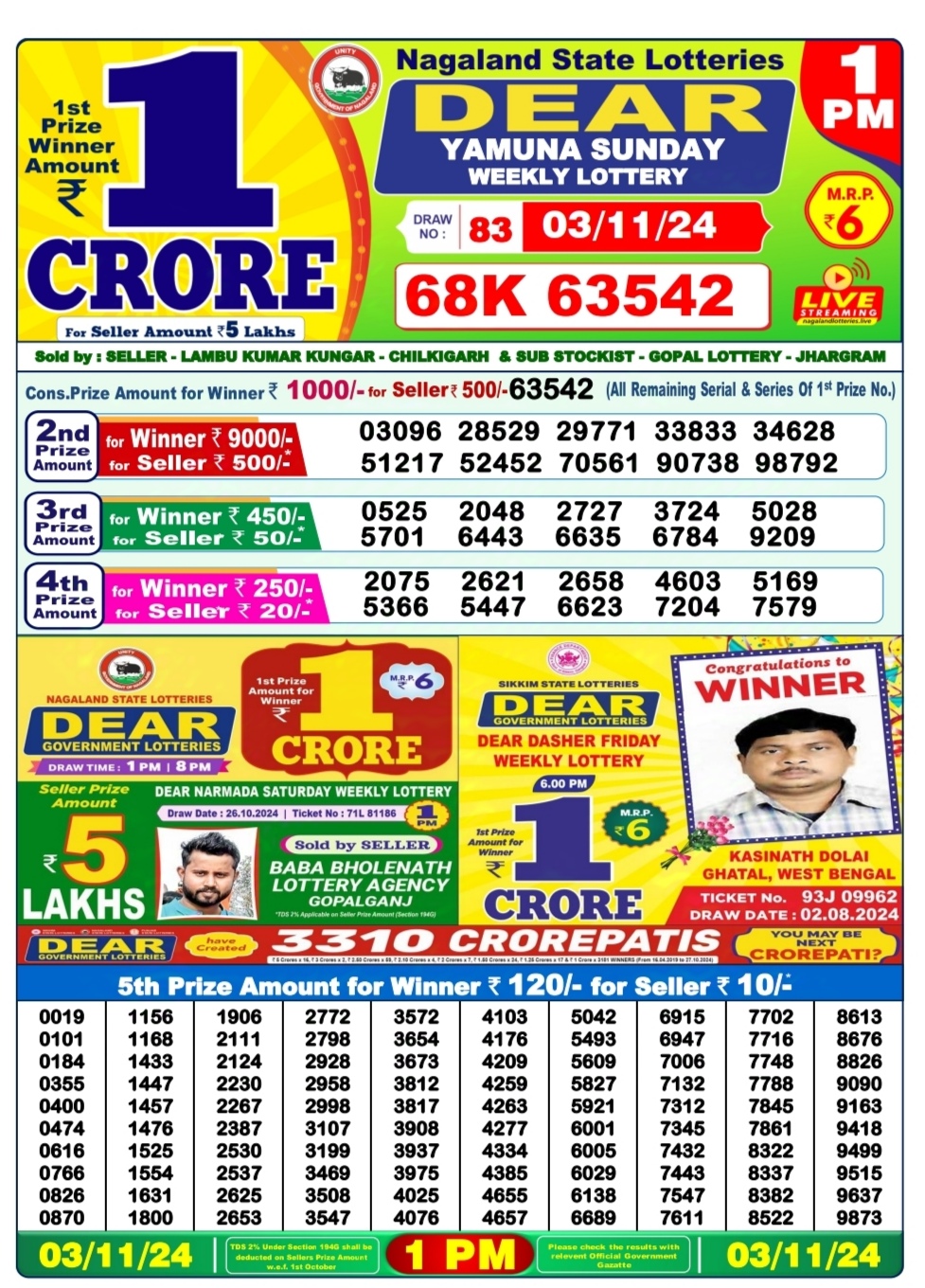 Dear yamuna sunday weekly lottery 1pm result 3/11/24