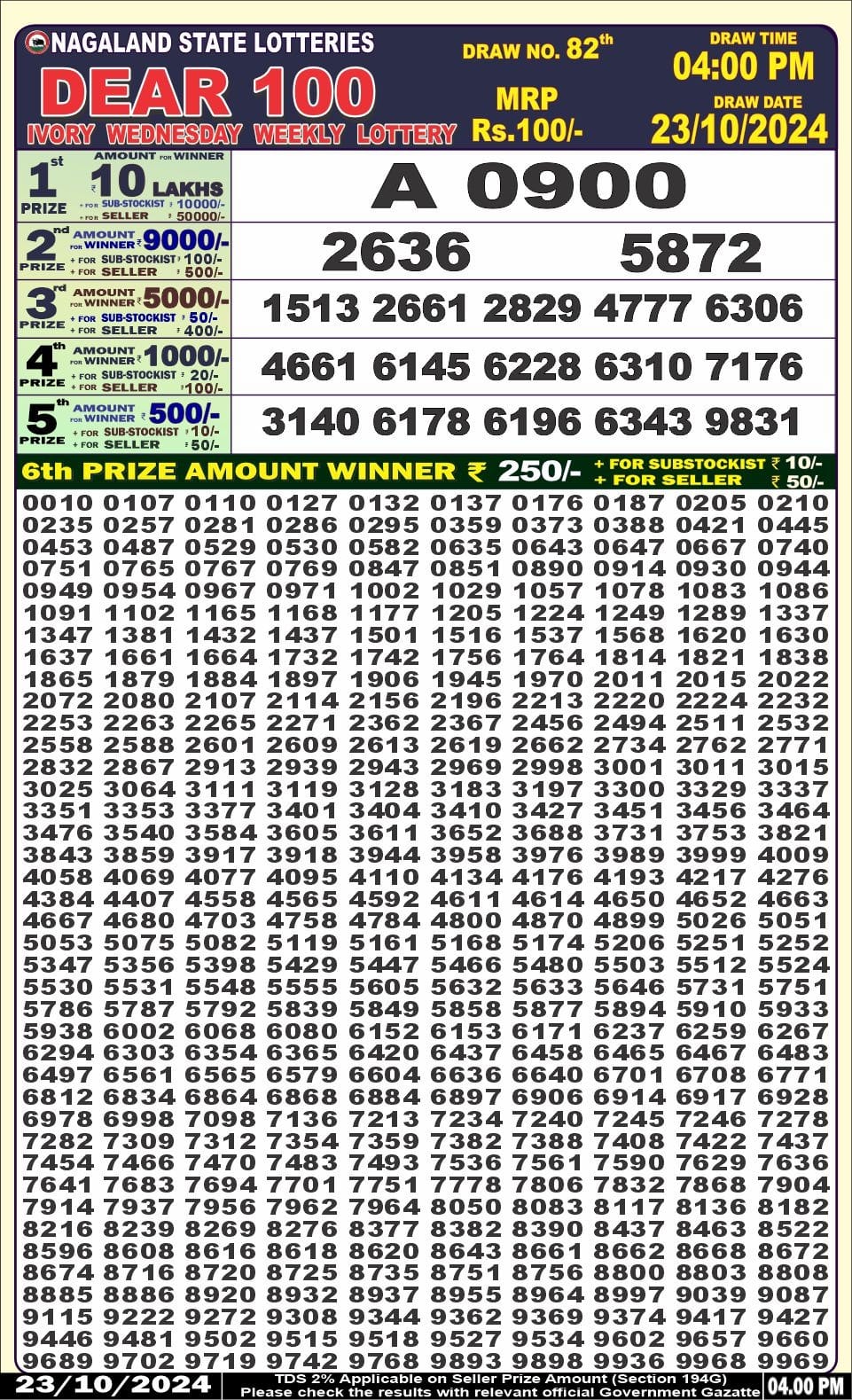 Dear100 ivory Wednesday weekly lottery 4pm result 23/10/24