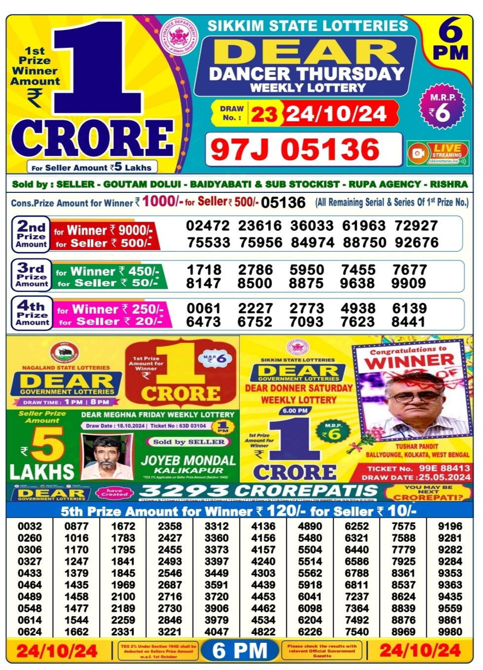 Dear mahanadi Thursday weekly lottery 1pm result 24/10/24