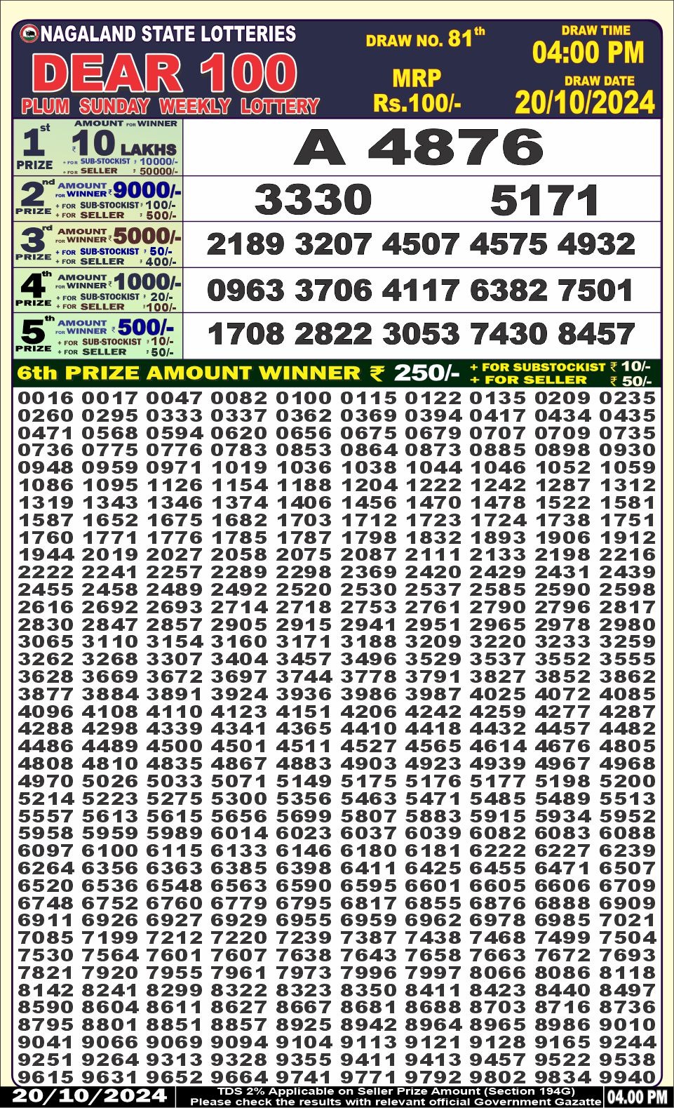 Dear100 plum sunday weekly lottery 4pm result 20/10/24