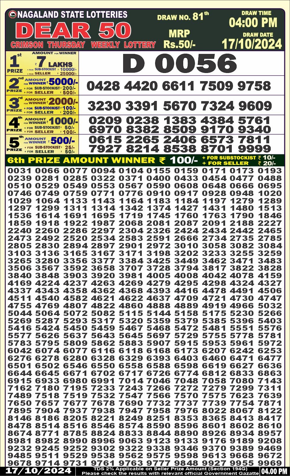 Dear50 crimson Thursday weekly lottery 4pm result 17/10/24