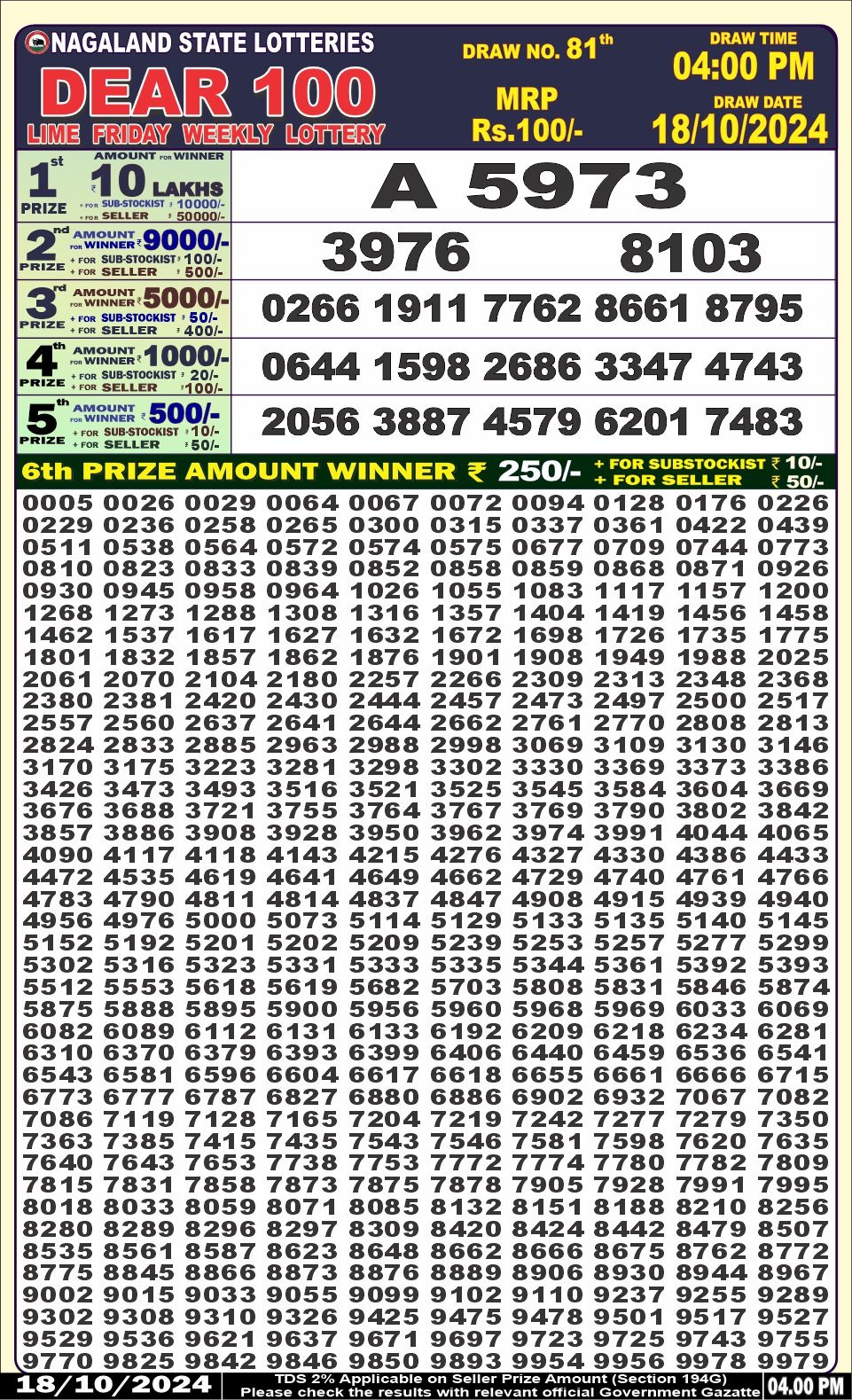 Dear100 lime Friday weekly lottery 4pm result 18/10/24