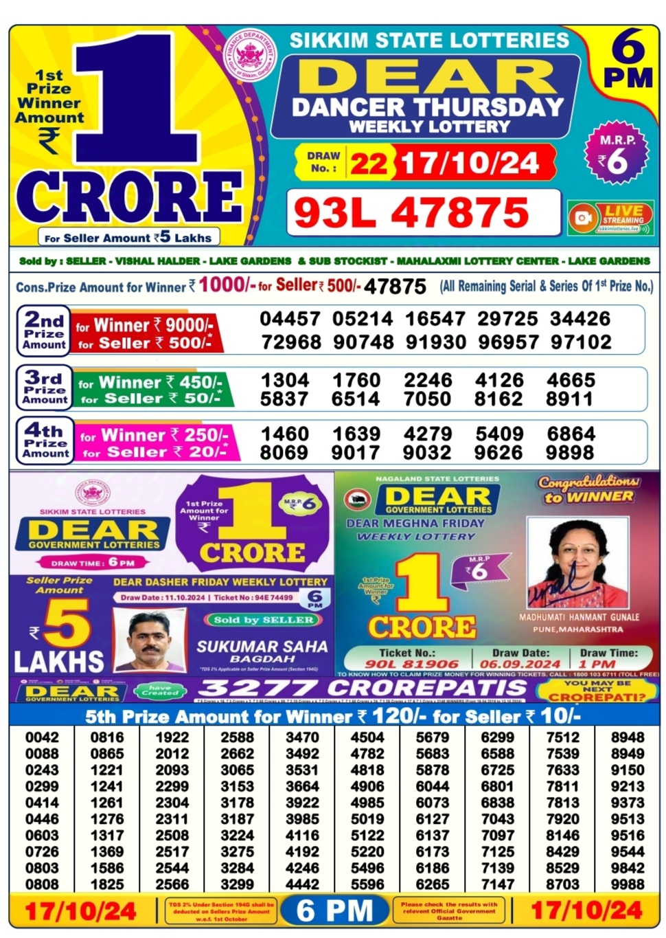 Dear dancer Thursday weekly lottery 6pm result 17/10/24