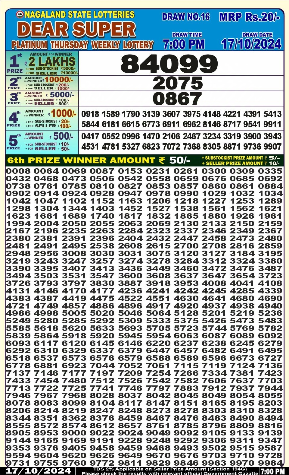 Dear super platinum Thursday weekly lottery 7pm result 17/10/24