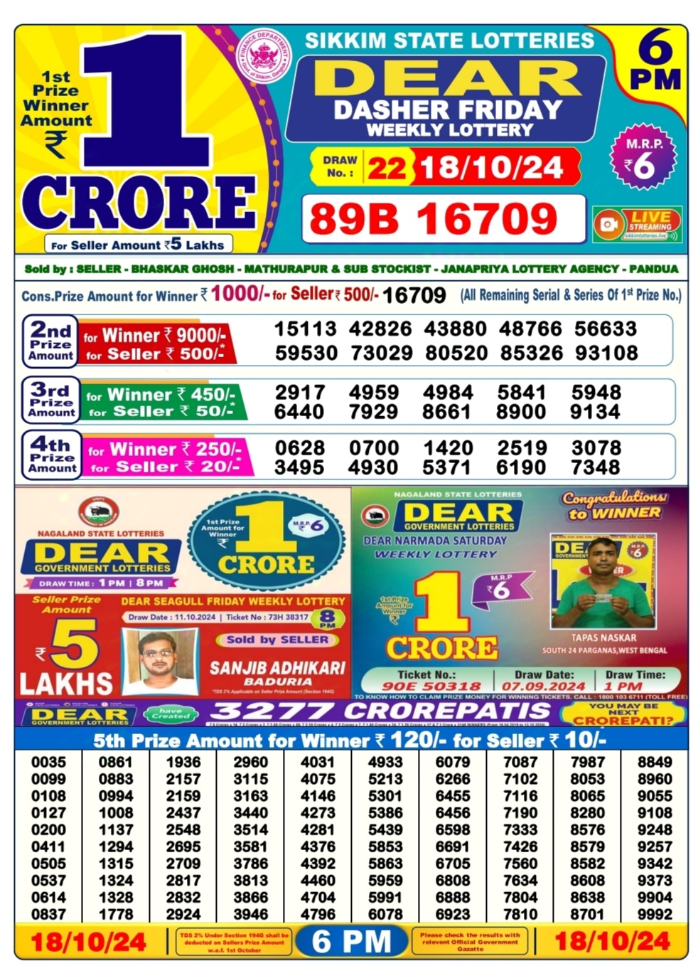 Dear dasher Friday weekly lottery 6pm result 18/10/24