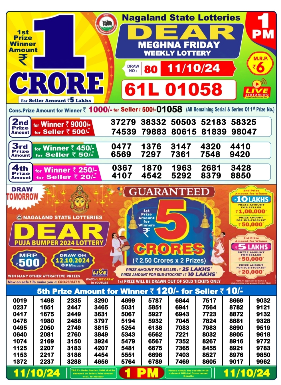 Dear meghna Friday weekly lottery 1pm result 11/10/24