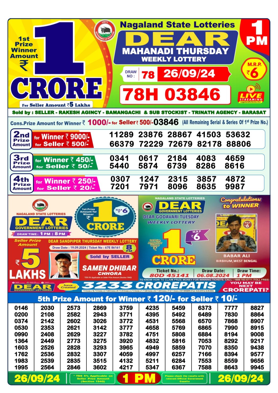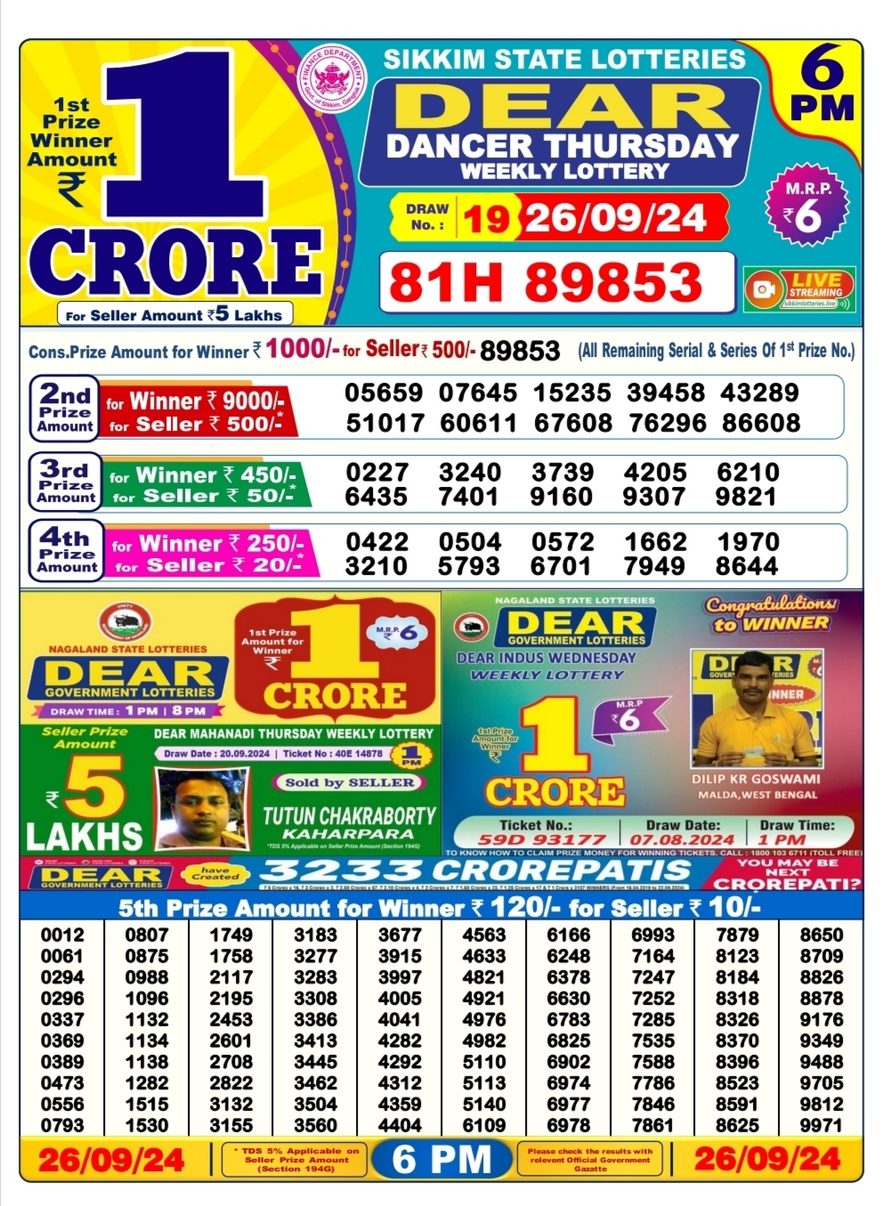 Dear mahanadi Thursday weekly lottery 1pm result 26/09/24