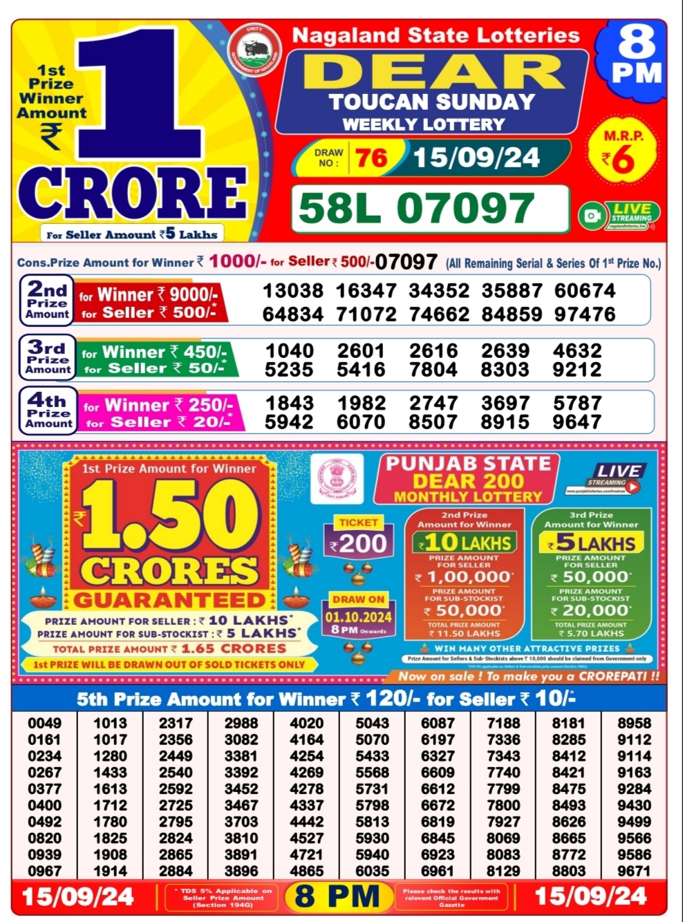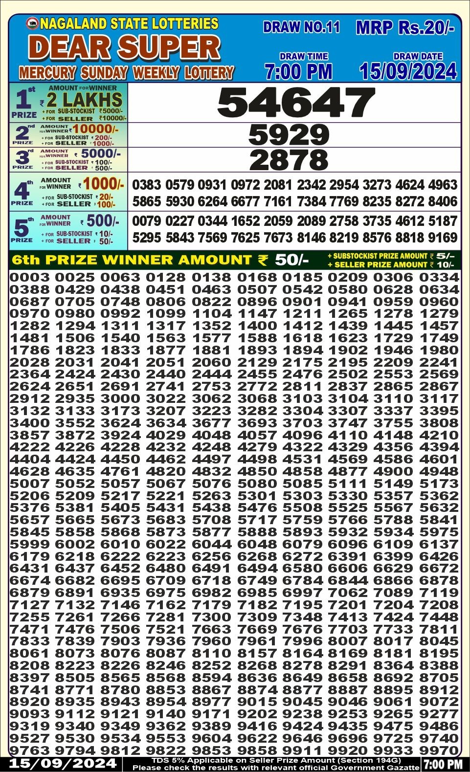 Dear super mercury sunday weekly lottery 7pm result 15/09/24