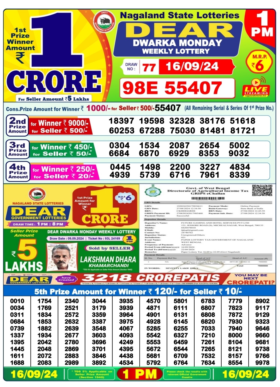 Dear dwarka monday weekly lottery 1pm result 16/09/24