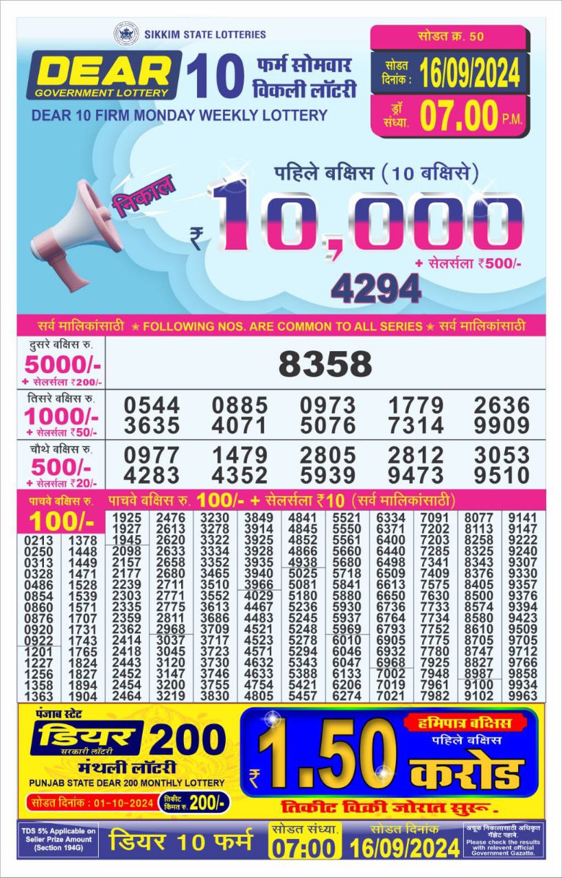 Dear10 firm monday weekly lottery 7pm result 16/09/24