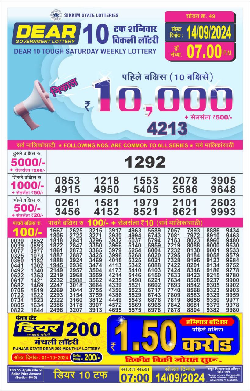 Dear10 tough saturday weekly lottery 7pm result 14/09/24