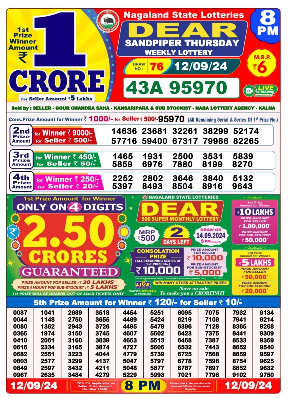 Dear super platinum Thursday weekly lottery 7pm result 12/09/24