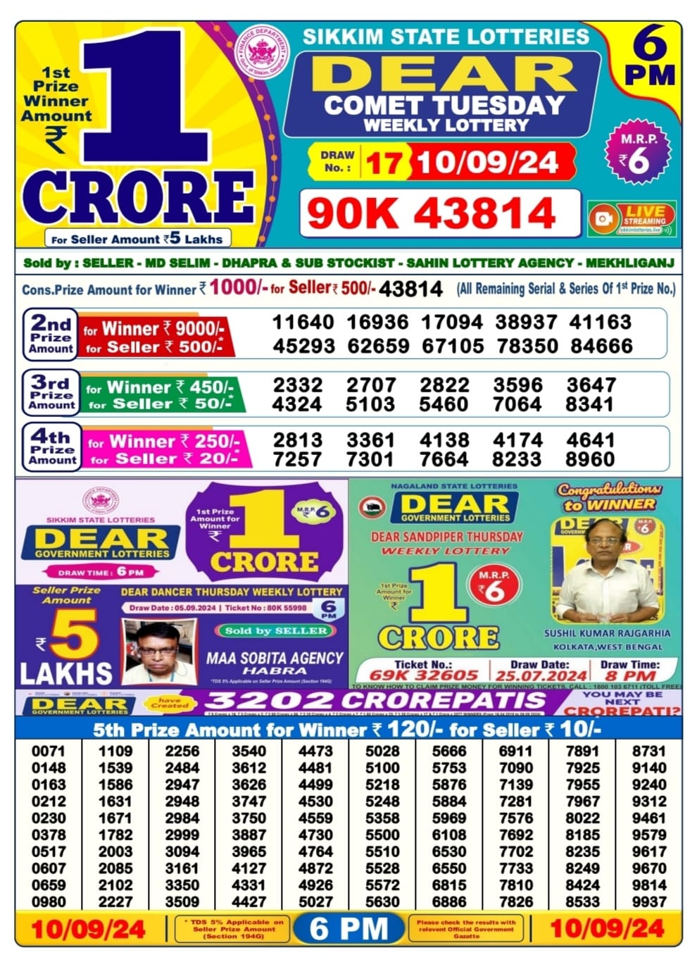Dear comet tuesday weekly lottery 6pm result 10/09/24