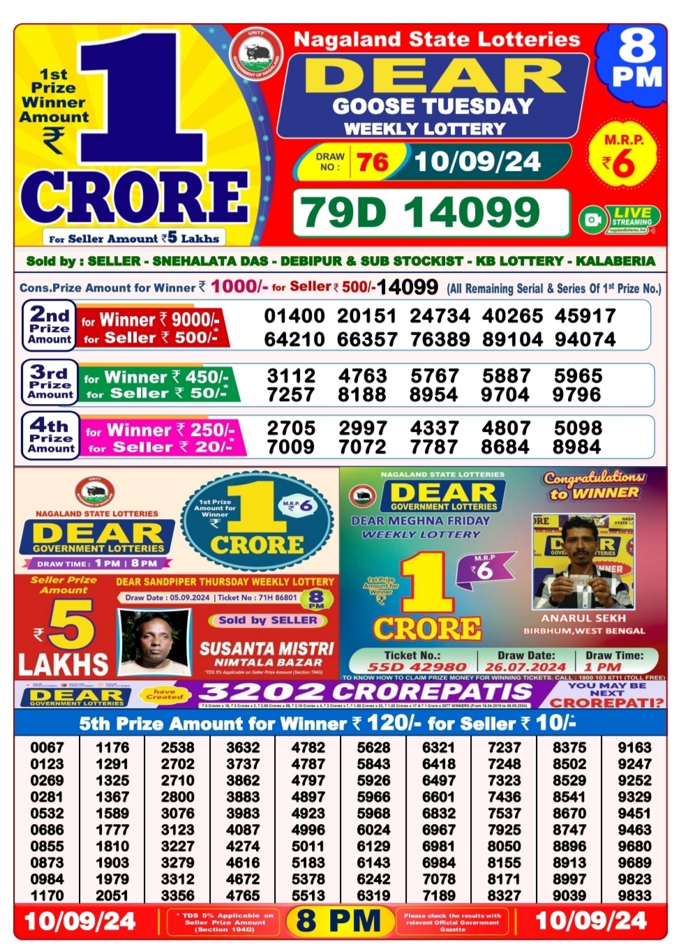 Dear10 firm monday weekly lottery 7pm result 9/09/24