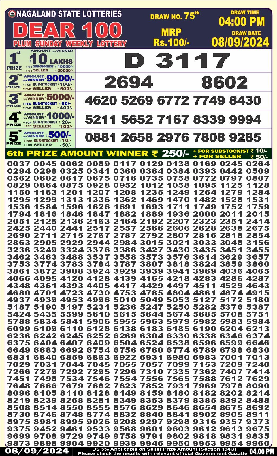 Dear100 plum sunday weekly lottery 4pm result 8/09/24