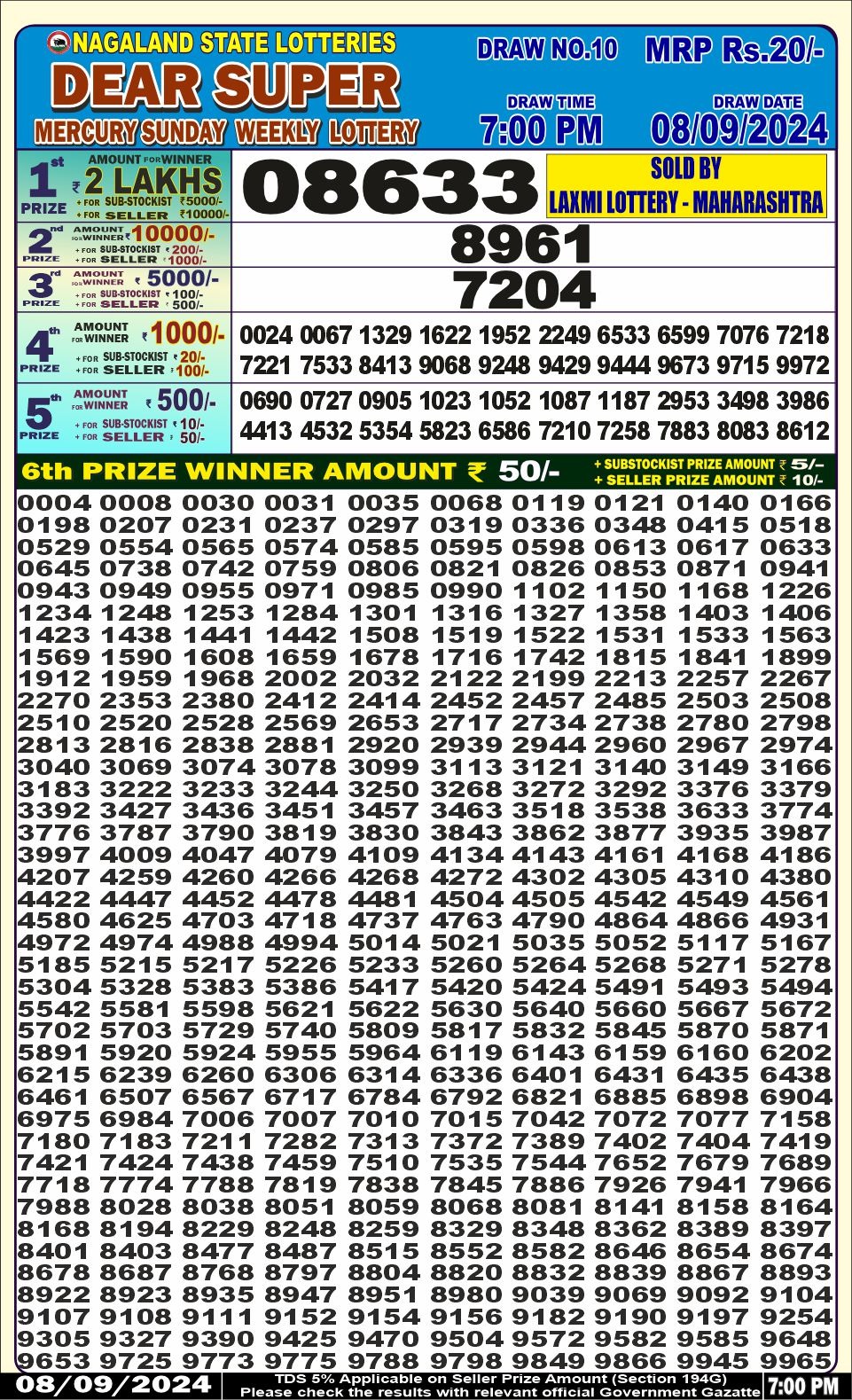 Dear10 wonder sunday weekly lottery 7pm result 8/09/24