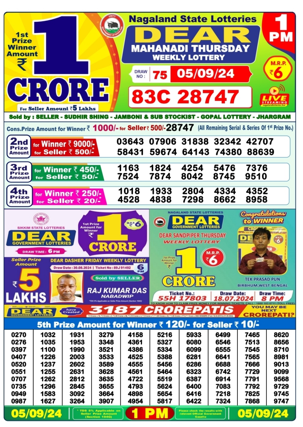 Dear mahanadi Thursday weekly lottery 1pm result 5/09/24