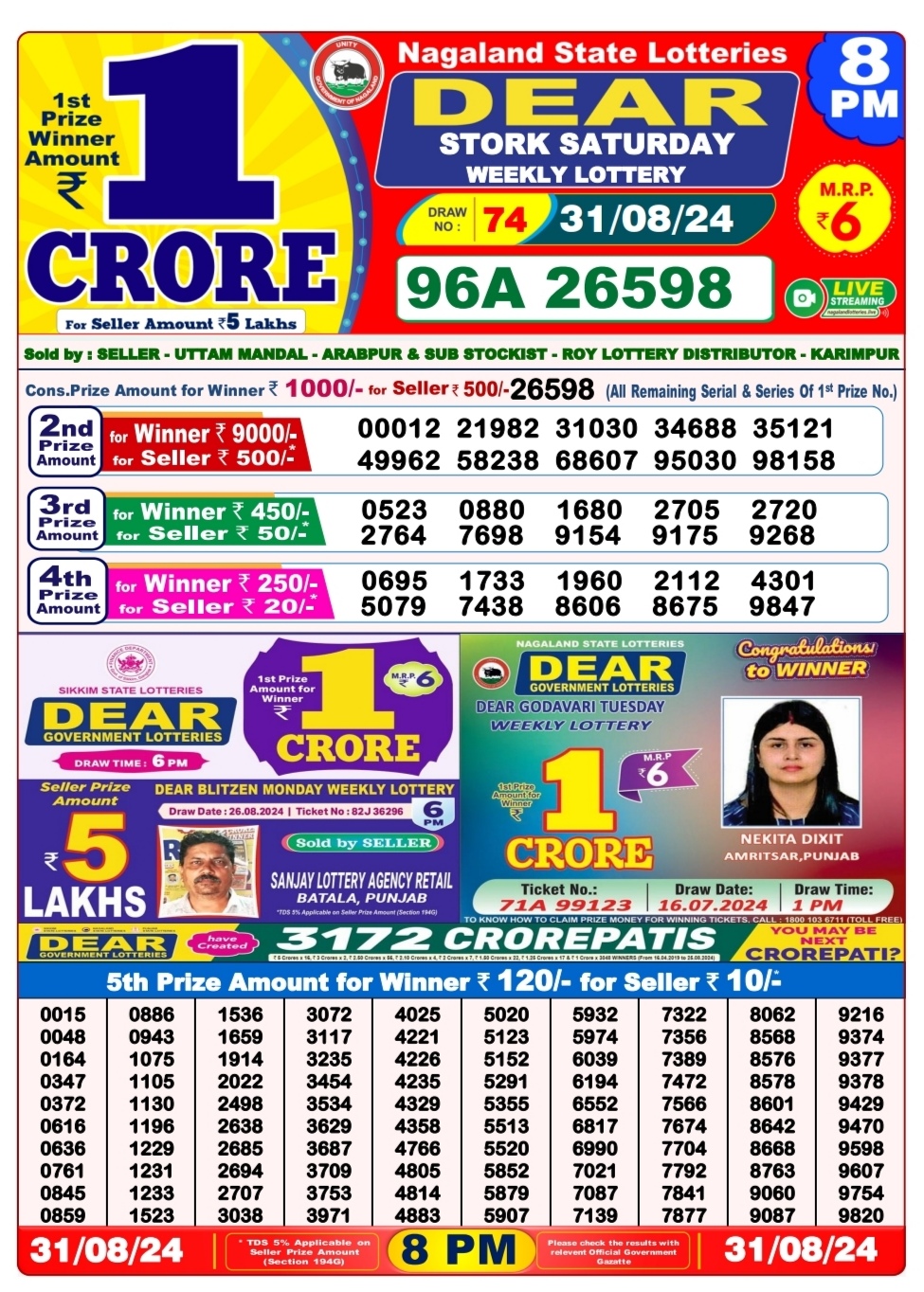 Dear stork saturday weekly lottery 8pm result 31/08/24