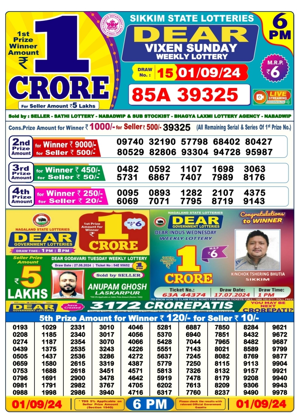 Dear super mercury sunday weekly lottery 7pm result 1/09/24