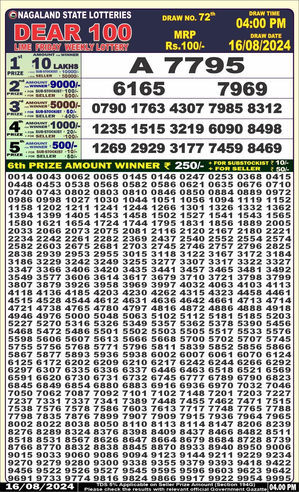 Dear100 lime Friday weekly lottery 4pm result 16/08/24