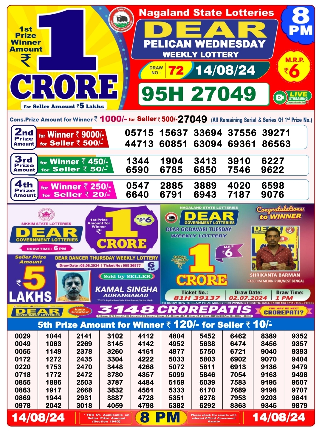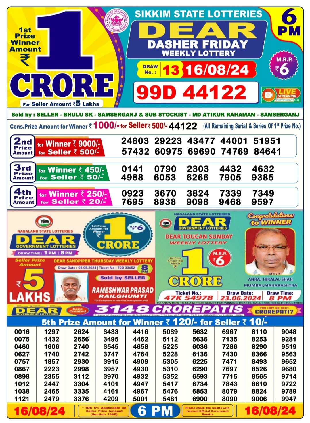 Dear dashar Friday weekly lottery 6pm result 16/08/24